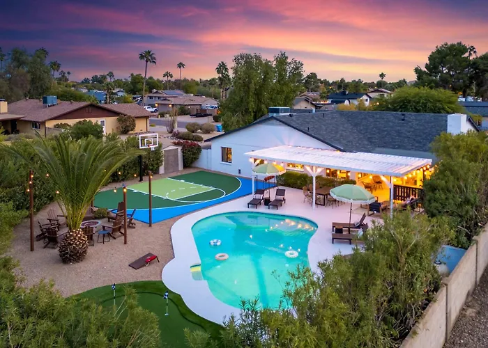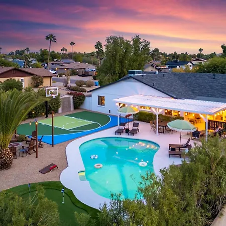 Desert Air 5 Bedroom Sports Court Pool Arcade Hot Tub villa beschikt over een ingerichte keuken met een oven en een vaatwasser. Eden's Grill met de Griekse keuken ligt in de buurt van de 3-badkamer accommodatie. De dichtstbijzijnde luchthaven is Phoenix Sky Harbor, op 30 km van de accommodatie. Deze villa biedt een privézwembad, evenals paardrijden en fietsen om de vrijetijdsbesteding van gasten te diversifiëren.